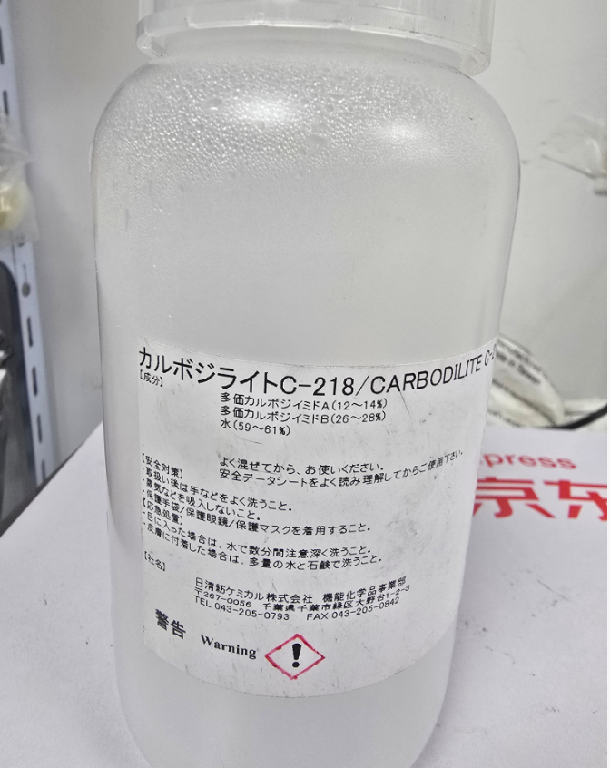 碳化二亚胺外观为乳白色液体,可添加在水性树脂(如水性聚氨酯,丙烯酸,环氧等)中,可增加水性涂料,油墨,胶水的交联度,提高水性涂料,油墨,胶水的光泽、硬度、耐水、耐溶剂、耐化学品和抗磨性能